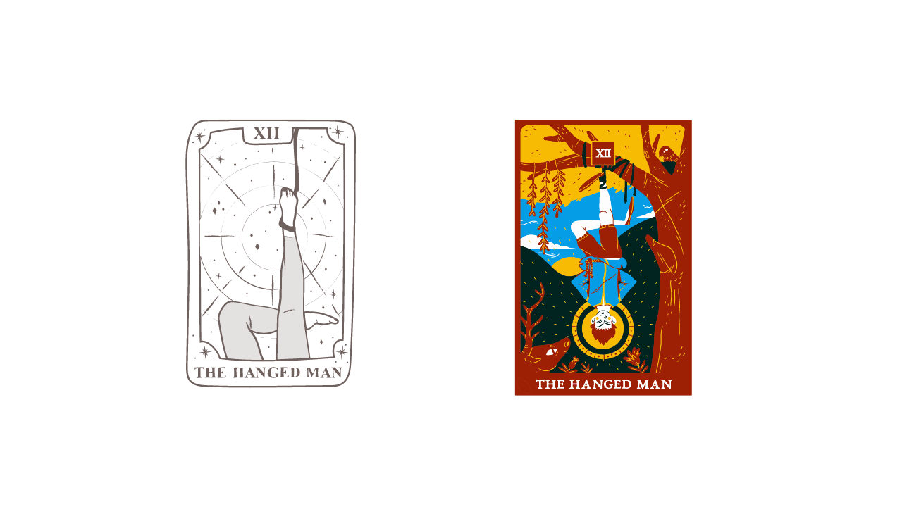 - 12(吊るされた男)→無力、ユートピア、夢想家、物質に影響力を及ぼせない精神